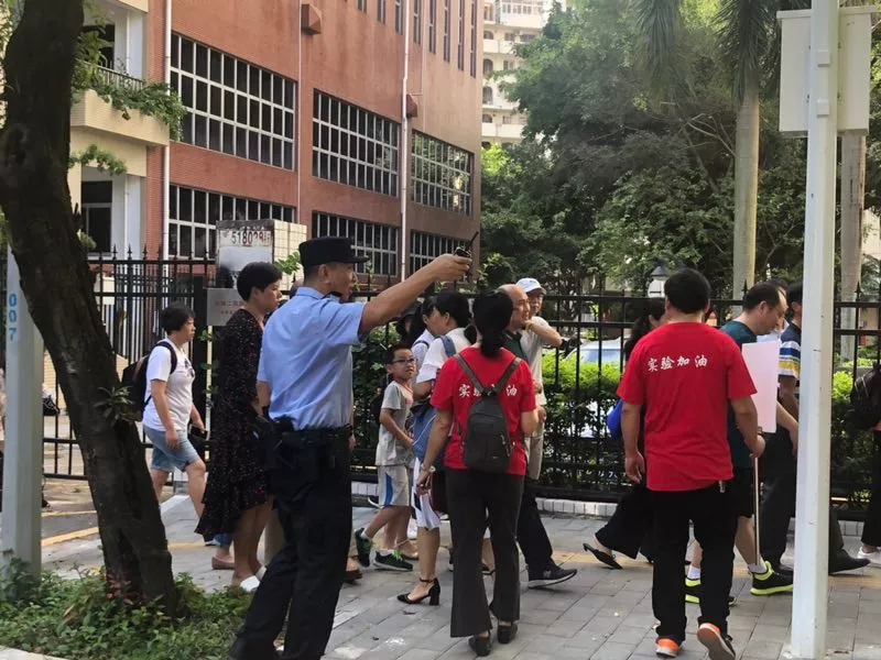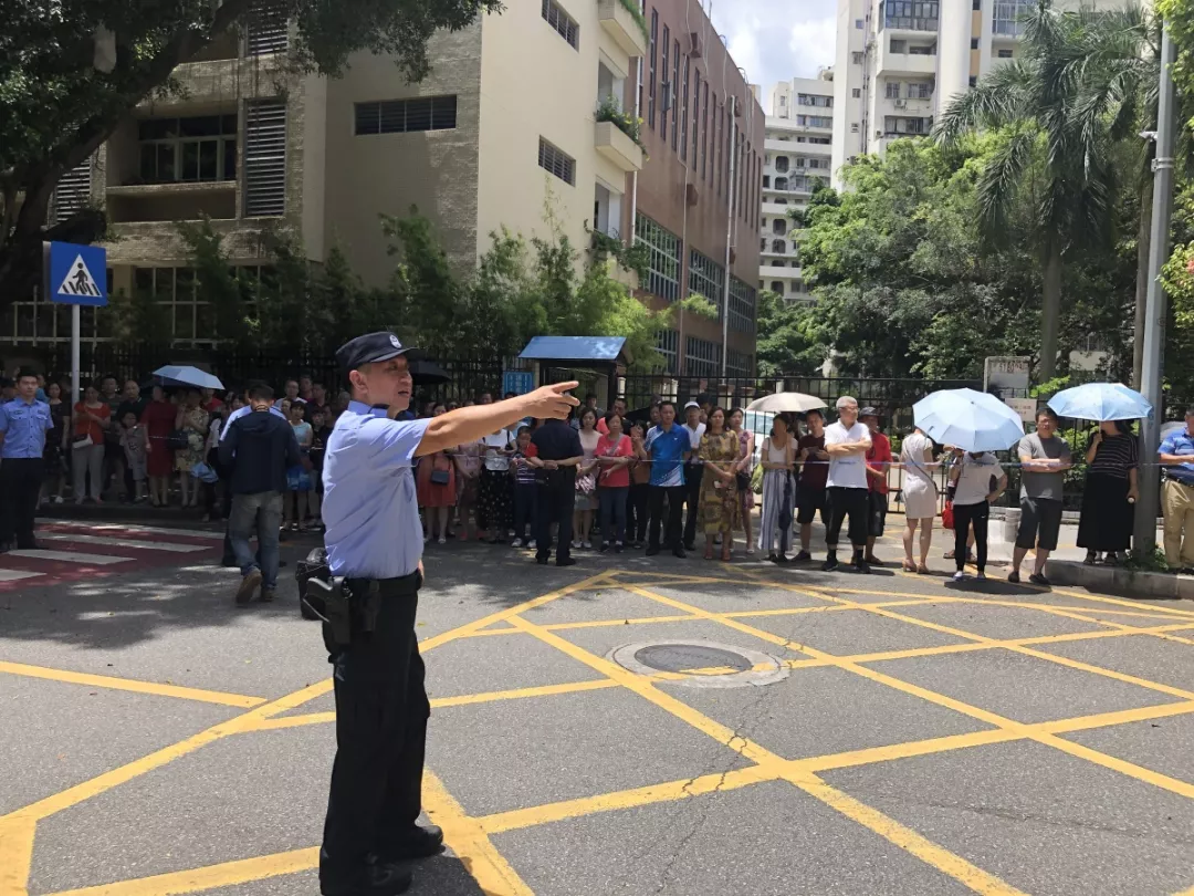 在深圳實驗中學的校門外,正在執(zhí)勤護考的通心嶺派出所所長林志強正跟送考的家長們“嘮嗑”?!按蠹叶颊具@么久了,辛苦了!一會考試結(jié)束后,咱們來猜一猜第一個走出來的是男生還是女生。”“我猜是男生?!薄拔也率桥!奔议L們一掃臉上焦急的表情,開始笑著討論起來。
