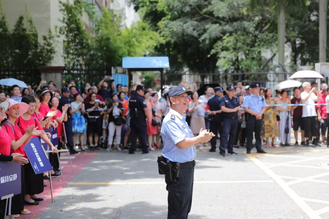 “鈴——”一聲長鈴響過之后,從校門口走出了一名女學生。“啪啪啪……”場外的掌聲馬上響起來,女孩愣了片刻,反應過來后馬上紅著臉跑開了,家長們也都跟著笑起來。這時,林志強趕緊組織好倒喇叭形人墻,一邊給隔離開的家長放行,一邊有序地疏散考生。45分鐘后,最后一名考生和家長都離開了考場,從早上6點就守在考點的林志強這才稍稍松了一口氣。