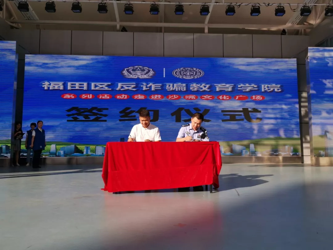 活動現(xiàn)場,肖劍平所長與沙頭街道辦黨工委副書記熊新清及沙嘴實業(yè)股份有限公司簽署了《福田反詐騙教育專刊》戰(zhàn)略合作協(xié)議。