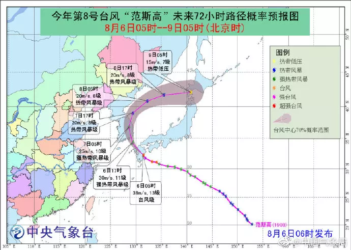 預計,“范斯高”將以每小時25-30公里的速度繼續(xù)向西北方向移動,將于今天晚上再次登陸韓國南部,爾后逐漸轉向東北方向移動,強度逐漸減弱。