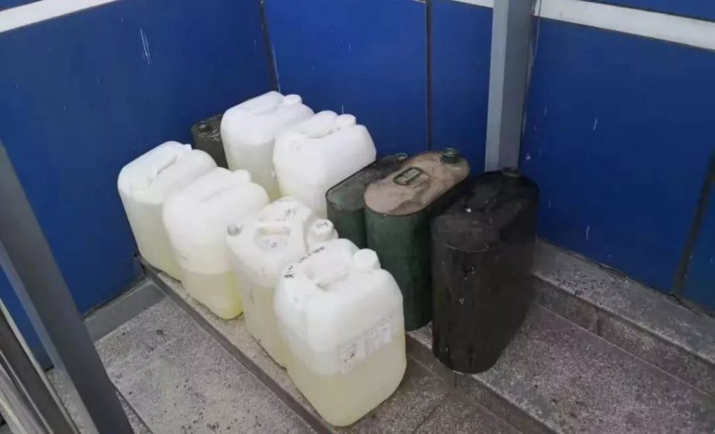 7月26日上午,深圳市交通運輸行政執(zhí)法支隊(以下簡稱"執(zhí)法支隊")光明大隊和新湖派出所民警開展聯(lián)合執(zhí)法行動,一輛車牌號為粵 NR***的小轎車引起了執(zhí)法人員的注意,這車的后排座位好像"坐"著啥東西。于是執(zhí)法人員示意該車靠邊停車接受檢查,走近后看真切了竟是一桶桶汽油,不僅后排座位有,后備箱也有,前前后后總共放了10桶。