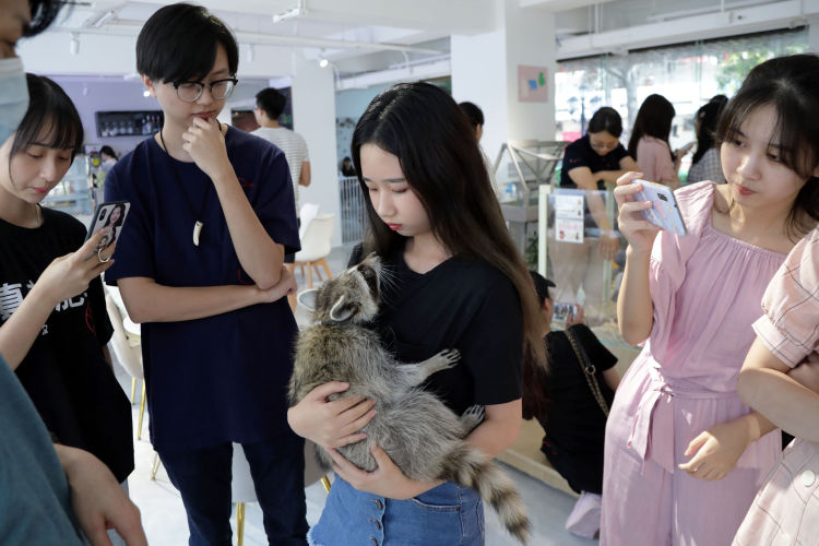 除了小動(dòng)物和飼養(yǎng)員們,這里還聚集了許多年輕女孩兒,她們有的相互認(rèn)識(shí),輪流跟店里的小浣熊撓癢癢拍照;有的不認(rèn)識(shí)彼此,卻因?yàn)轱曫B(yǎng)過同樣的小動(dòng)物而熟絡(luò)起來,相互傳授養(yǎng)育自家"孩子"的經(jīng)驗(yàn)。這只名為"六一"的小浣熊是這里的常駐小動(dòng)物,面對市民們的熱情,"六一"毫不客氣地躺在小姐姐的臂彎里撒嬌,引來其他市民們爭相拍照。