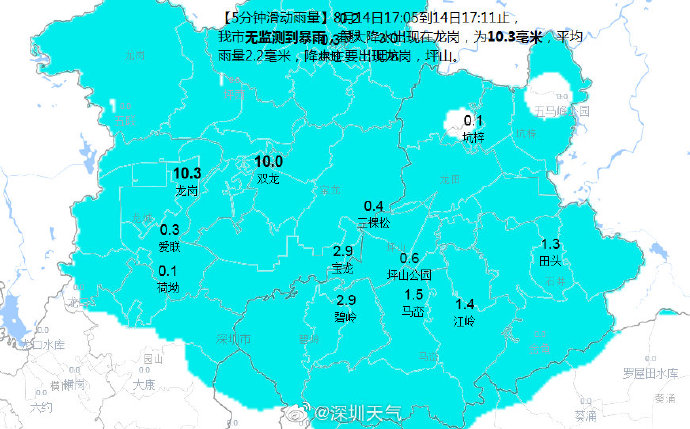 預(yù)計坪山區(qū)和龍崗區(qū)(坪地、寶龍、龍崗、龍城街道)1小時內(nèi)將出現(xiàn)30毫米左右降水,深圳市氣象臺于2019年08月14日17時05分在坪山區(qū)和龍崗區(qū)(坪地、寶龍、龍崗、龍城街道)發(fā)布暴雨黃色分區(qū)預(yù)警,全市進入暴雨戒備狀態(tài),請注意防范。