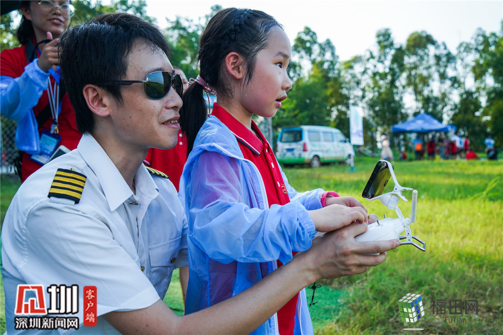 無人機(jī)飛行課程,小朋友在飛手的指導(dǎo)下學(xué)習(xí)操作無人機(jī)。
