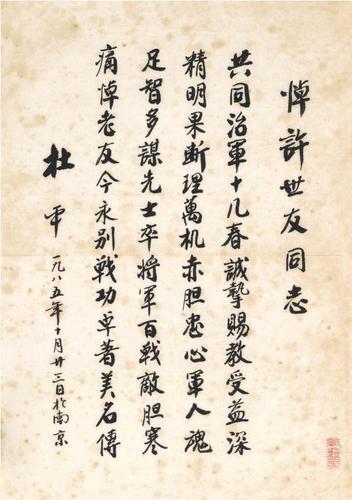 在采訪一位又一位身經(jīng)百戰(zhàn)的幸存者時,吳東峰與他們的筆墨緣也就此結(jié)下?!?985年許世友將軍因病逝世,杜平將軍親手書寫‘悼許世友同志’詩一首,請我送《人民日報》刊登,我把詩傳真過去,原件保存下來了。這首詩見證了杜平與許世友的深厚友情,是我最早的將軍墨跡手藏。那之后,我開始有意識地收集將軍們的筆墨。”