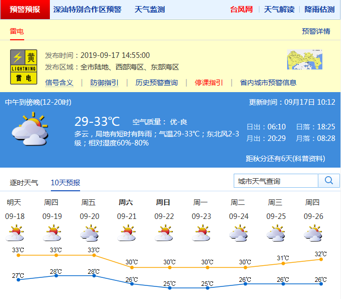 深圳市氣象臺于9月17日14時55分在全市發(fā)布雷電預(yù)警,預(yù)計60分鐘內(nèi)全市將受雷電影響,按照防御預(yù)案停止戶外易燃易爆危險作業(yè),并加強危化場所安全管理。