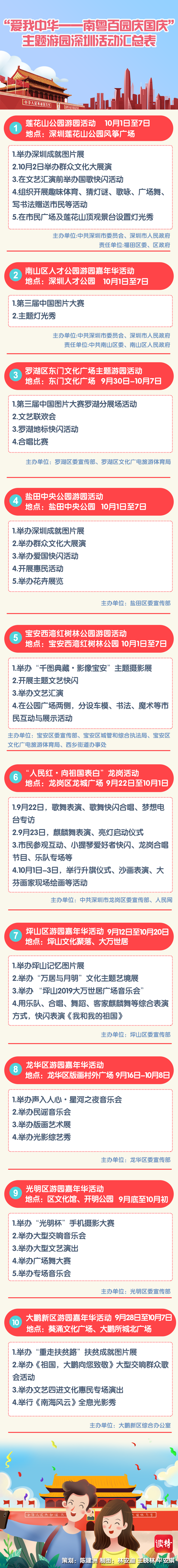 深圳特區(qū)報(bào)2019年9月26日訊 為熱烈慶祝中華人民共和國(guó)成立70周年,深圳市將舉辦規(guī)模盛大的全市性專場(chǎng)音樂(lè)會(huì)、群眾文藝晚會(huì)、焰火晚會(huì)等活動(dòng),同時(shí)將在各區(qū)舉辦80場(chǎng)“我和我的祖國(guó)”國(guó)慶群眾文藝嘉年華活動(dòng),并在全市各區(qū)舉行“愛(ài)我中華——南粵百園慶國(guó)慶”主題游園。各有關(guān)活動(dòng)安排如下: