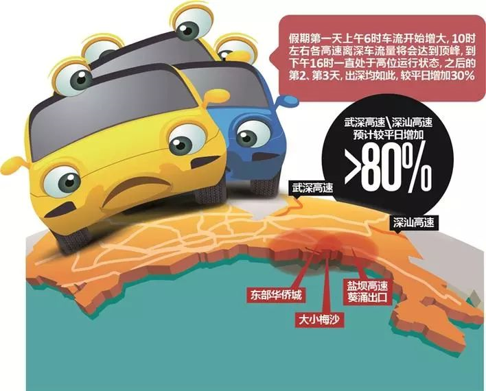⑩深圳交警預(yù)測(cè)全市從9月30日下午開(kāi)始交通流量加大,9月30日、10月1日出行量達(dá)到頂峰。各高速公路、市內(nèi)各景點(diǎn)、商圈、購(gòu)物點(diǎn)以及東部景區(qū)會(huì)出現(xiàn)不同程度的擁堵,全市各區(qū)羅湖區(qū)最為擁堵,其次是福田區(qū)、南山區(qū)。預(yù)計(jì)‘國(guó)慶’期間,全市出深和入深車(chē)輛總數(shù)均將超過(guò)170萬(wàn)輛。