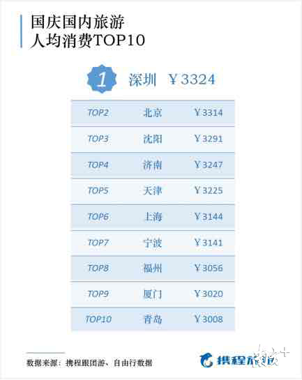 哪些城市居民的平均消費(fèi)最高?根據(jù)攜程跟團(tuán)游和自由行數(shù)據(jù),“國(guó)內(nèi)游消費(fèi)力前十強(qiáng)城市”依次為深圳、北京、沈陽(yáng)、濟(jì)南、天津、上海、寧波、福州、廈門和青島。這些城市國(guó)慶旅游單次國(guó)內(nèi)游人均花費(fèi)超過(guò)3000元,其中深圳人最舍得花錢,單次國(guó)內(nèi)旅游人均花費(fèi)達(dá)到了3324元。