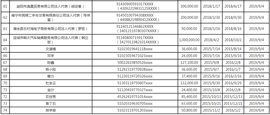 據(jù)深圳市地方金融監(jiān)督管理局披露的網(wǎng)絡(luò)借貸信息中介機(jī)構(gòu)失信人信息表顯示,74名失信網(wǎng)貸借款人中,有5名是企業(yè)的法人代表,分別為運(yùn)城市天年商貿(mào)有限公司法人代表張俊兵、益陽市逸晨貿(mào)易有限公司法人代表熊迎春、南寧市亮輝二手車交易有限責(zé)任公司法人代表肖傳富、清徐縣樂村淘電子商務(wù)有限公司法人代表羅棟及運(yùn)城市韓大汽車銷售服務(wù)有限公司法人代表韓立哲。其中,運(yùn)城市韓大汽車銷售服務(wù)有限公司法人代表韓立哲逾期金額居首,達(dá)到了100萬元,借款時(shí)間是2018年4月2日,逾期開始時(shí)間是2018年10月2日,截至2019年10月9日已逾期一年多。