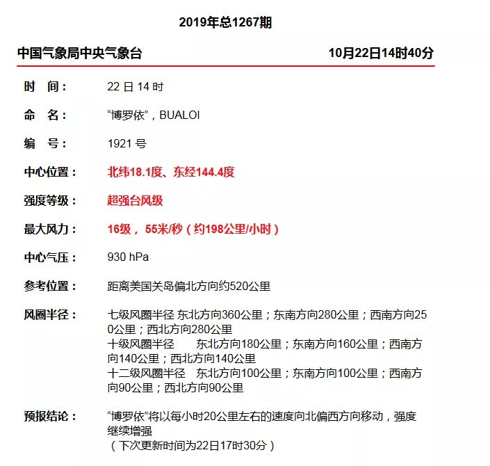 今年第21號(hào)臺(tái)風(fēng)“博羅依”已于10月22日凌晨加強(qiáng)為強(qiáng)臺(tái)風(fēng)級(jí),早晨5點(diǎn)鐘其中心位于美國(guó)關(guān)島北偏東方向約370公里的西北太平洋洋面上,就是北緯16.7度、東經(jīng)145.5度,中心附近最大風(fēng)力有14級(jí)(42米/秒),中心最低氣壓為955百帕,七級(jí)風(fēng)圈半徑180-280公里,十級(jí)風(fēng)圈半徑100-160公里,十二級(jí)風(fēng)圈半徑50-80公里。