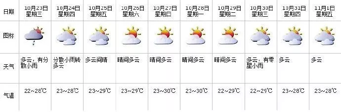 10月23-24日云量增多有分散小雨:23日云量增多,有分散小雨,24日分散小雨轉(zhuǎn)多云,最低氣溫21-22℃、最高氣溫27-28℃;25-29日多云到晴,空氣干燥。