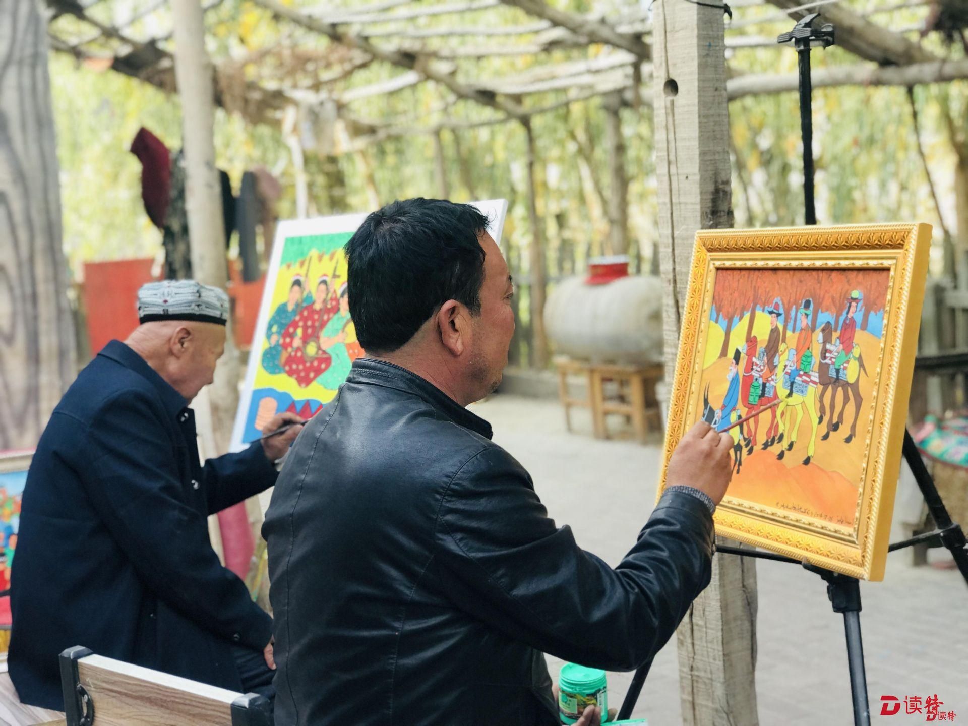國家級農民畫畫家木卡熱埔江·艾海提告訴記者記者,他現在一年有將近45000元的收入,一部分來自于在安居房上畫農民畫,一年有30000塊錢的收入,另一部分是自己賣出的畫,一年能掙15000?!艾F在麥蓋提旅游的人多了,看到他們喜歡我的畫,我感到很高興,現在越畫越有勁了!”聊起麥蓋提的發(fā)展,木卡熱埔江的臉上難掩喜悅。