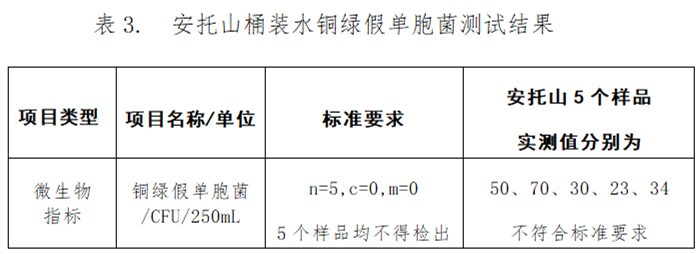 值得注意的是,安托山包裝飲用水檢出銅綠假單胞菌不符合國家標準要求,其他11款桶裝水的微生物指標均符合國家要求。經(jīng)反饋,生產(chǎn)廠家深圳市廣進源飲品有限公司回函聲稱不是他們公司生產(chǎn)的產(chǎn)品,但截至發(fā)稿廠家并未提供任何證明材料。