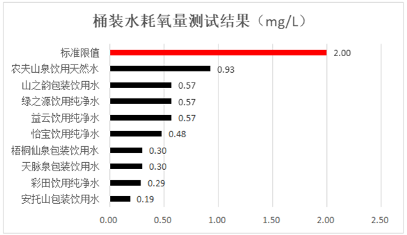 12款桶裝水污染物安全測試均符合標準要求。其中,耗氧量方面,所有飲用純凈桶裝水和其它飲用桶裝水耗氧量均符合標準要求,安托山、彩田、天脈泉和梧桐仙泉包裝飲用水受有機污染更少;所有飲用純凈桶裝水和其它飲用桶裝水三氯甲烷符合標準要求,農(nóng)夫山泉飲用天然水和山之韻包裝飲用水未檢出,表現(xiàn)更好。