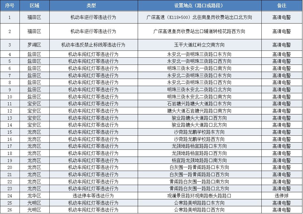 見圳客戶端·深圳新聞網2019年11月2日訊 日前,記者從深圳市公安局交通警察局獲悉,為確保交通執(zhí)法工作的公開公正、體現人性化管理,深圳市公安局交通警察局啟用了26套固定式交通技術監(jiān)控設備。其中,高清電警25套,違停球1套,分別設置在福田區(qū)、羅湖區(qū)、鹽田區(qū)、寶安區(qū)、龍崗區(qū)、龍華區(qū)、光明區(qū)等7個區(qū)。那么,這些“電子警察”分別在以上7個區(qū)的哪些路口“站崗”?下面一起看看↓↓