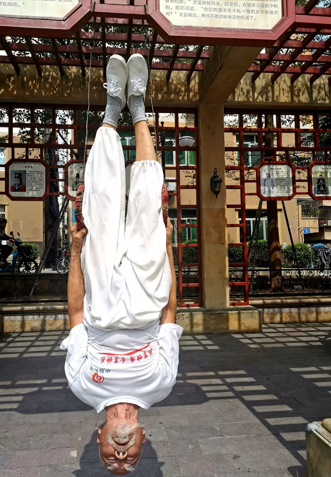 魏宗信還自信地表示:“我還能在吊環(huán)上倒立,在雙桿上玩翻身?!泵刻焐衔绾拖挛缂悠饋?,他要運動兩三個小時。