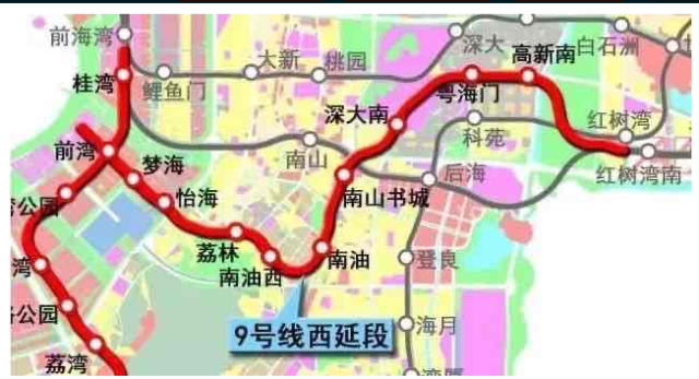 地鐵9號線西延線(二期)線路東起紅樹灣南站,經(jīng)深圳灣至前海灣,全長約10.8公里,站點為前灣、夢海、怡海、荔林、南油西、南油、南山書城、深大南、粵海門、高新南、紅樹灣南。其中,換乘站為5座,在前灣站換乘5號線、南油站換乘12號線、深大南站換乘15號線、粵海門站換乘13號線、紅樹灣站換乘11號線。