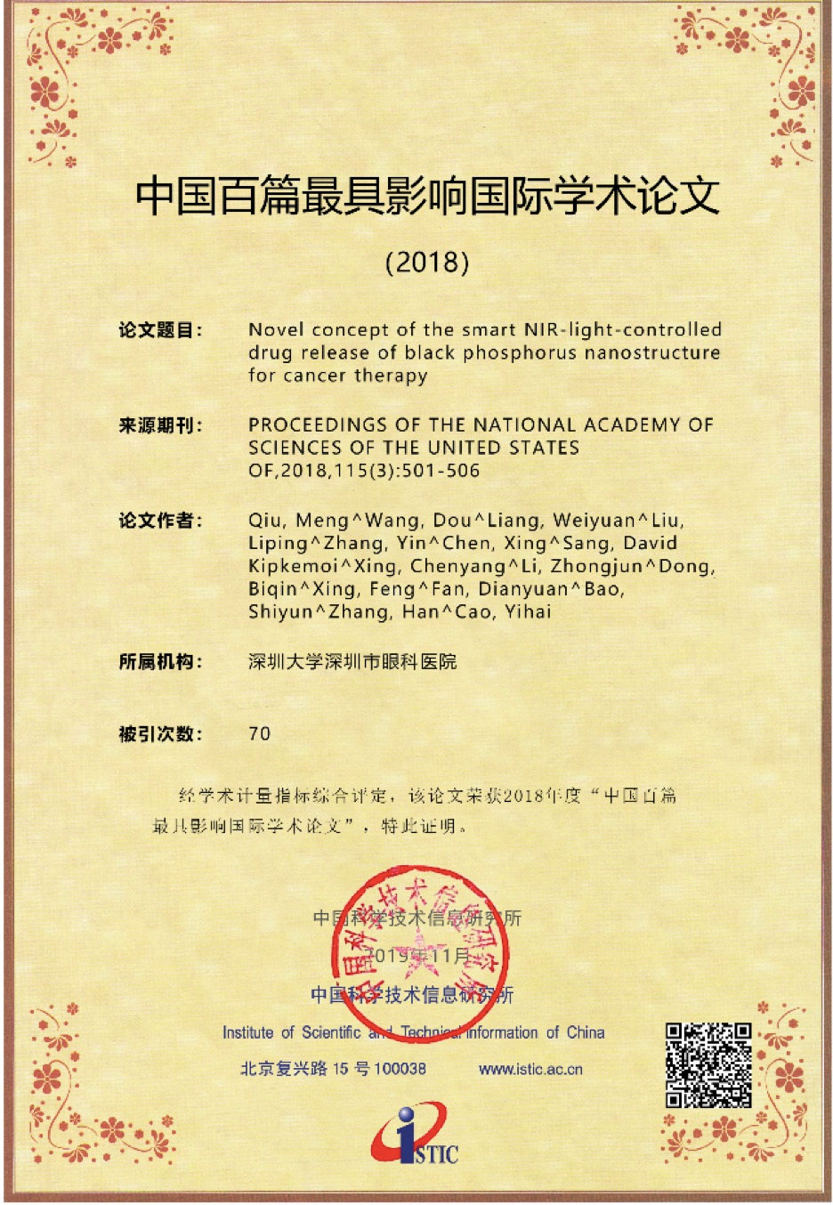 深圳特區(qū)報2019年11月22日訊 11月19日,中國科學技術信息研究所在北京召開中國科技論文統(tǒng)計結果發(fā)布會,公布了2018年中國百篇最具影響國際學術論文。深圳大學張晗教授課題組2篇論文入選,深大入選數(shù)量在中國內地高校和研究機構中并列第10。