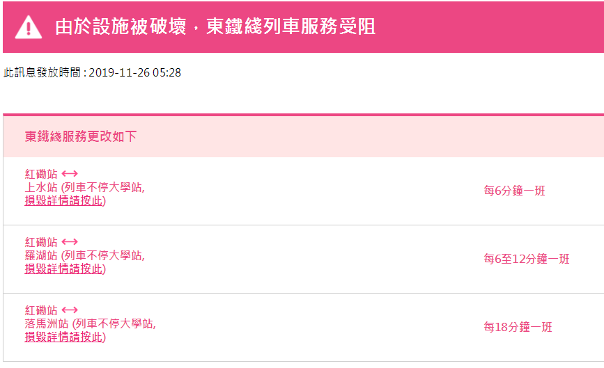 據(jù)港鐵消息,11月26日,香港地鐵各線(機(jī)場(chǎng)快線除外)、輕鐵及港鐵巴士的服務(wù)將于晚上11:30時(shí)結(jié)束。大學(xué)站繼續(xù)關(guān)閉,列車不停大學(xué)站。個(gè)別車站出入口也會(huì)暫時(shí)關(guān)閉。