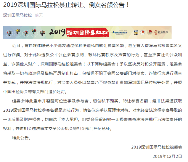 12月2日,深馬組委會發(fā)布公告,對于此種違反公平公正參賽原則、破壞比賽秩序及聲譽(yù)的行為,甚至損害社會公眾利益、詐騙他人財產(chǎn),深圳國際馬拉松組委會(以下簡稱組委會)予以堅決反對和公開譴責(zé)。
