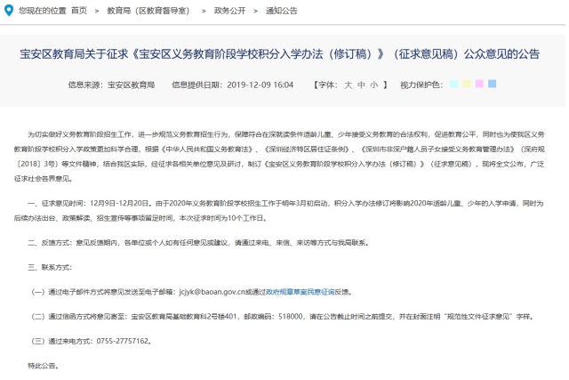 記者剛剛從寶安區(qū)教育局獲悉,12月9日,寶安區(qū)教育局發(fā)布關(guān)于征求《寶安區(qū)義務(wù)教育階段學(xué)校積分入學(xué)辦法(修訂稿)》(征求意見稿)的公告,就寶安區(qū)義務(wù)教育階段學(xué)校積分入學(xué)辦法修訂進(jìn)行征求意見。