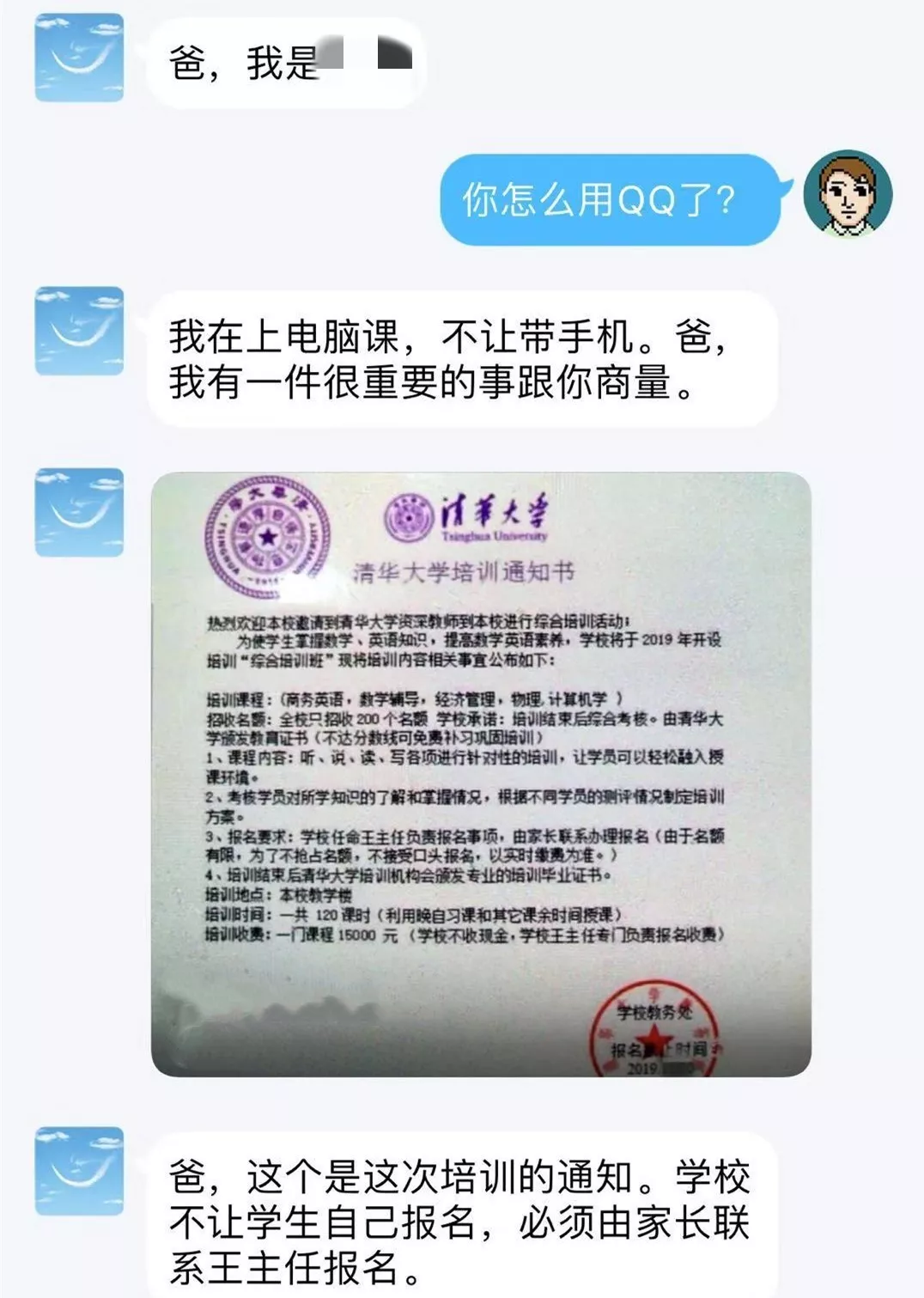 而他有一件重要的事情要與家長(zhǎng)商量。接著發(fā)來(lái)了一張《清華大學(xué)培訓(xùn)通知書(shū)》。