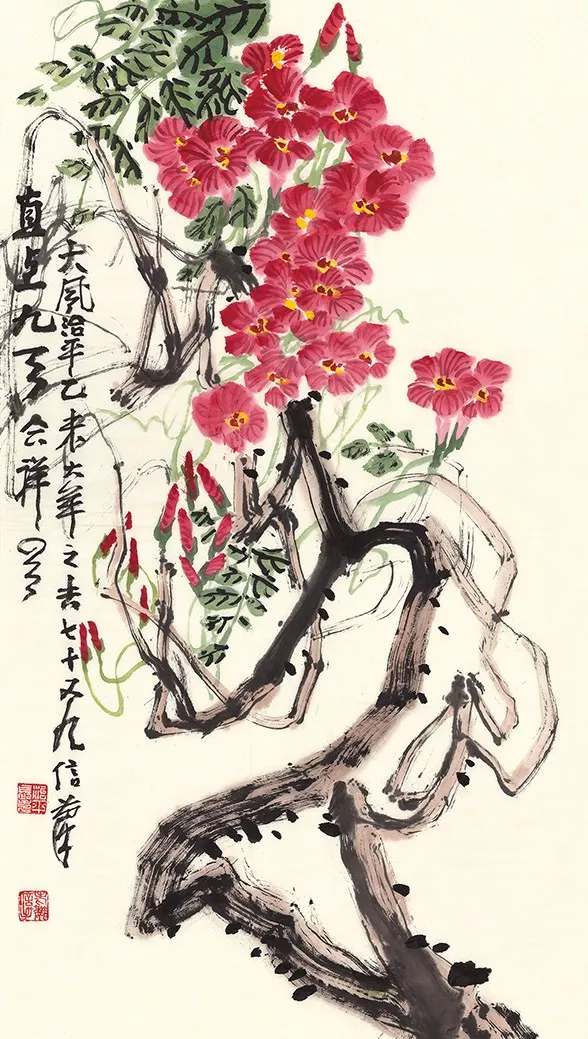 魏治平的藝術(shù)貴于創(chuàng)造,以書(shū)法入畫(huà),畫(huà)中常見(jiàn)有篆書(shū)筆意。三十年前長(zhǎng)江日?qǐng)?bào)總編海洋先生,曾提筆寫(xiě)下《魏瘋子傳奇》,洋洋灑灑八千言,一時(shí)間荊楚大地震動(dòng)。西泠印社理事朱妙根稱其“方寸之間有靈山,紅花墨葉又一派”。西泠印社執(zhí)行社長(zhǎng)、中國(guó)印學(xué)博物館館長(zhǎng)劉江先生為其第一本書(shū)畫(huà)作品集題簽書(shū)名。美國(guó)前總統(tǒng)老布什收有魏老書(shū)法作品“龍蛇競(jìng)走舞長(zhǎng)空、點(diǎn)染梅花分外紅。且賦新詩(shī)遙寄意,長(zhǎng)江密水兩相通”。印第安納州州立大學(xué)博物館大廳懸掛的便是魏老八尺紅梅詩(shī)書(shū)畫(huà)中堂。