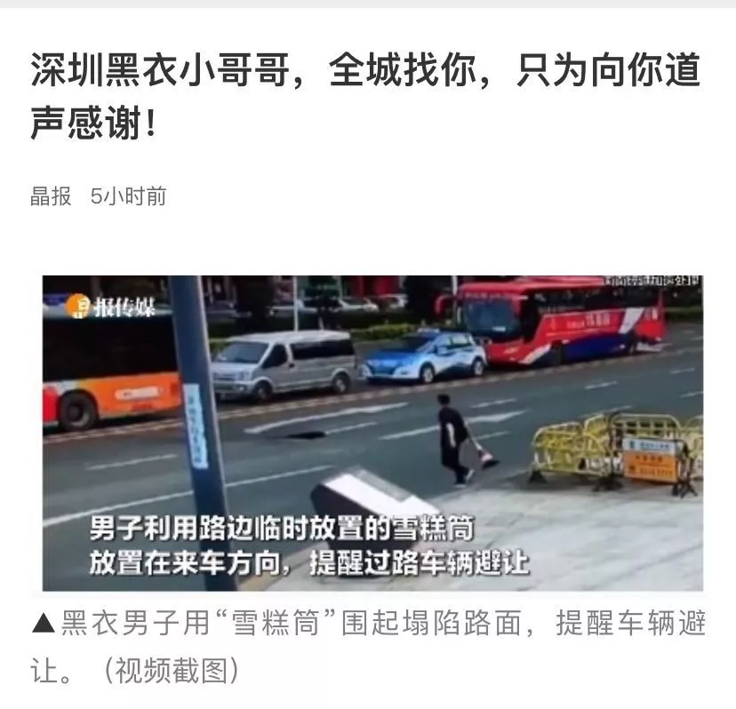 5月16日傍晚時(shí)分,一名身穿黑衣的青年男子經(jīng)過南山海德一路和后海濱路交匯處時(shí)發(fā)現(xiàn)路面有塌陷并出現(xiàn)不小的洞口,車輛擦邊迅疾而過險(xiǎn)象環(huán)生,于是從路邊找來若干雪糕筒擺在洞口來車方向提醒司機(jī)繞洞而行,從而避免了交通事故的發(fā)生。