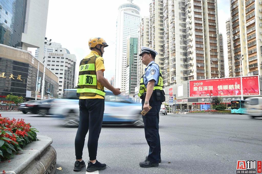 2019年4月23日,深南東路,深圳交警開展和外賣小哥角色互換的活動,美團外賣小哥趙春曉正在路口執(zhí)勤。