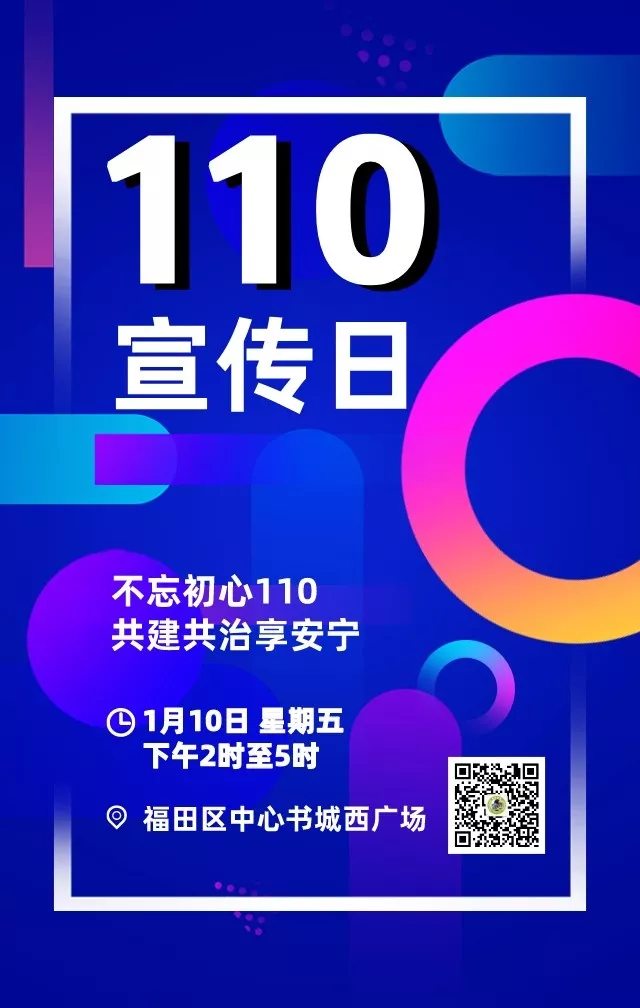 “110宣傳日”來(lái)啦!1月10日下午2時(shí)至5時(shí),福田區(qū)中心書城西廣場(chǎng)將作為“110宣傳日”主會(huì)場(chǎng),本次活動(dòng)主題是“不忘初心110,共建共治享安寧”。
