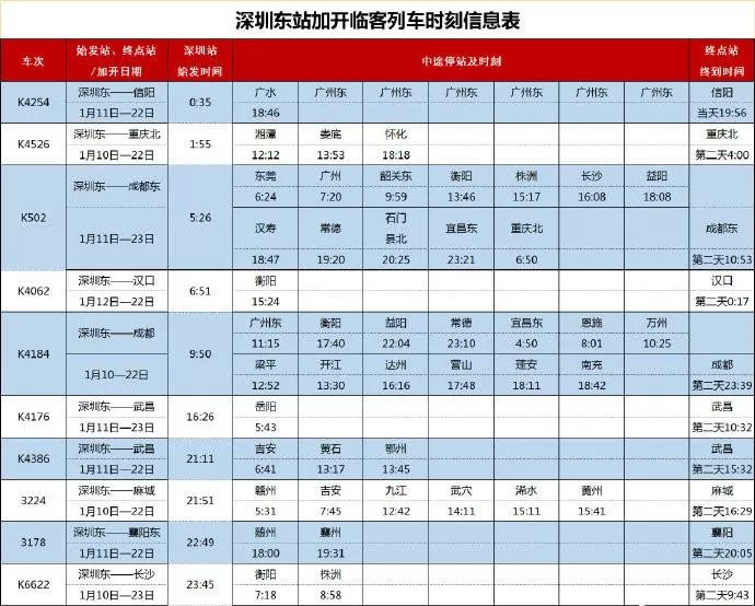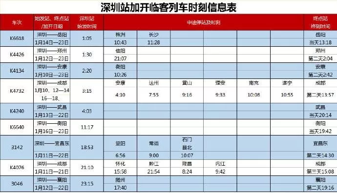 春節(jié)前,深圳站和深圳東站單天將最多加開19趟臨時(shí)長(zhǎng)途旅客列車,其中深圳站始發(fā)9趟,深圳東站始發(fā)10趟。