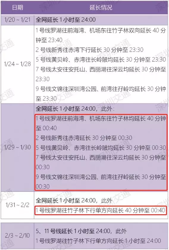 2020年春運(yùn)期間深圳地鐵延長(zhǎng)情況表