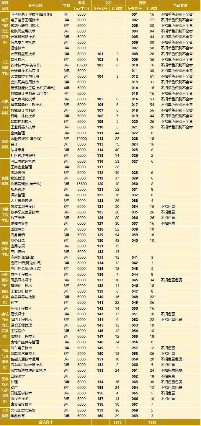 ②以下各招生專業(yè)、專業(yè)代號、計劃數(shù)、選報證書、特征要求等及其它備注以廣東省招生辦公布的專業(yè)目錄為準;