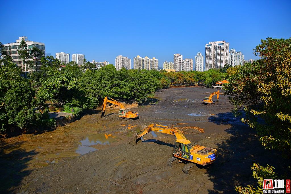 抽干東湖水后長(zhǎng)臂挖機(jī)進(jìn)行清淤作業(yè)。