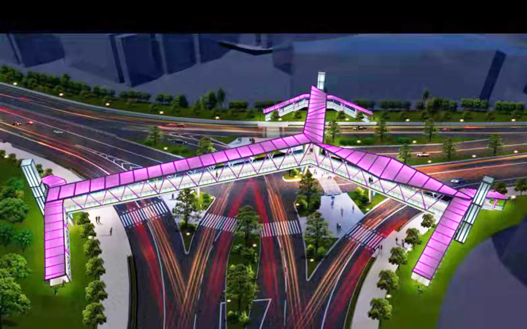 據(jù)介紹,東濱路人行天橋項目位于南山區(qū)東濱路與南山大道的三岔路口,經(jīng)前期多個概念性方案設(shè)計比選,最終采用三個方向主梁互為 120°交角的“Y”形方案,共計 6座鋼結(jié)構(gòu)梯道和3部垂直電梯。完工后,這座漂亮的人行天橋或?qū)⒊蔀槭忻翊蚩ǖ木W(wǎng)紅景點。