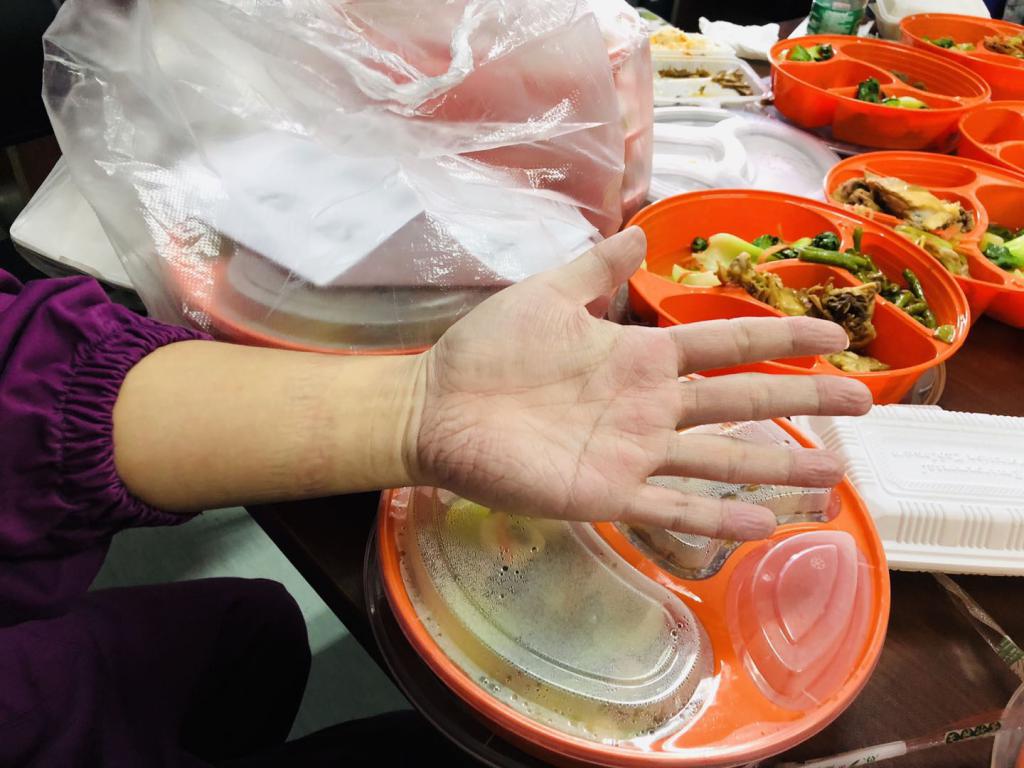 ▲大年三十下午2時左右,深圳市第三人民醫(yī)院感染 ICU病房的護士剛吃上飯。他穿著防護服、戴著口罩,悶得透不過氣來,渾身都是汗。手被泡得起了皺,臉上依然還有口罩壓著的痕跡。