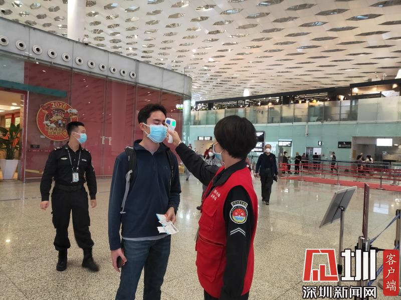 在深圳機場,工作人員對往來乘客進行體溫檢測。