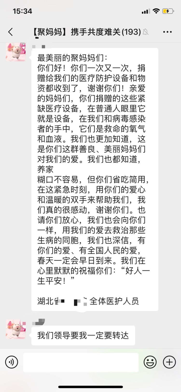 “最美麗的聚媽媽們,你們捐贈(zèng)的這些緊缺醫(yī)療設(shè)備,在普通人眼里它就是設(shè)備,在我們和病毒感染者的手中,它們是救命的氧氣和血液”,武漢一家醫(yī)院的醫(yī)護(hù)人員在近日發(fā)來的感謝信中說,“請(qǐng)你們放心,我們也會(huì)向你們一樣,用我們的愛去救治那些生病的同胞,我們也深信,有你們的愛、有全國人民的愛,春天一定會(huì)早日到來?!保ㄓ浾哧愭?