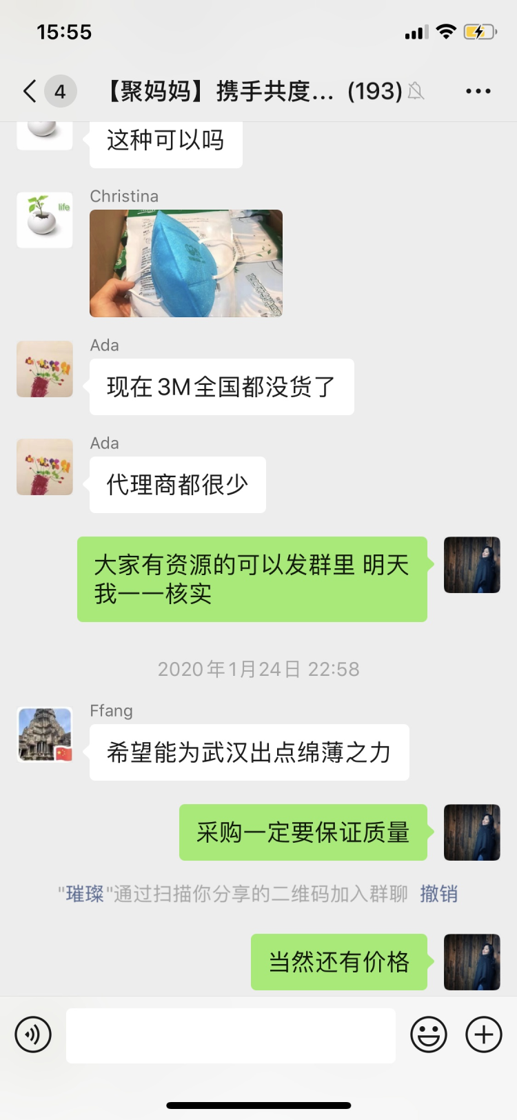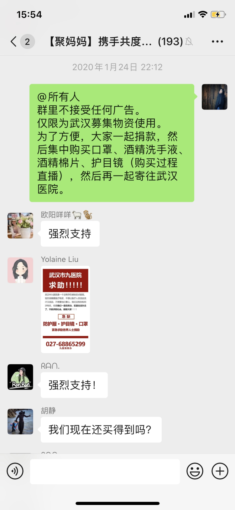 這一百多名媽媽是一個(gè)名為“聚媽媽攜手共渡難關(guān)”(以下簡稱“聚媽媽”)微信群的成員,Miya是“聚媽媽”的發(fā)起人之一。1月24日除夕那天,Miya與一位朋友聊起疫情,兩人都覺得,醫(yī)院缺物資,一兩人的力量又太單薄,不如發(fā)動(dòng)朋友們一起購買直接送到醫(yī)院。Miya在當(dāng)晚9點(diǎn)左右建了這個(gè)臨時(shí)群,并邀請(qǐng)周圍熟識(shí)的朋友加入。