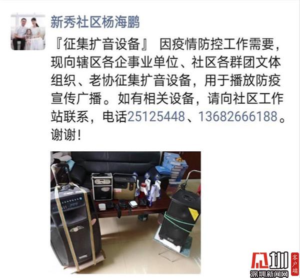 疫情面前,小廣播能發(fā)揮大作用,方便大力宣傳防疫知識。疫情在不斷蔓延,廣播宣傳任務(wù)任務(wù)緊急,而其中新秀社區(qū)一時(shí)沒有足夠的擴(kuò)音設(shè)備,于是,立即向居民、社會團(tuán)體、企業(yè)等發(fā)出征集令。新秀社區(qū)黨委書記楊海鵬在微信朋友圈發(fā)布了征集信息及聯(lián)系電話。沒想到這征集令一發(fā)出,很快就得到了市民朋友的積極響應(yīng)。
