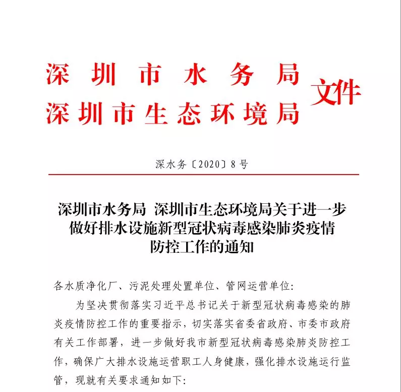 早在1月30日,深圳市水務(wù)局、深圳市生態(tài)環(huán)境局就聯(lián)合發(fā)布了《關(guān)于進一步做好排水設(shè)施新型冠狀病毒感染的肺炎疫情防控工作通知》(以下簡稱《通知》),提前部署,明確要求全市要全力以赴做好排水設(shè)施疫情防控工作。