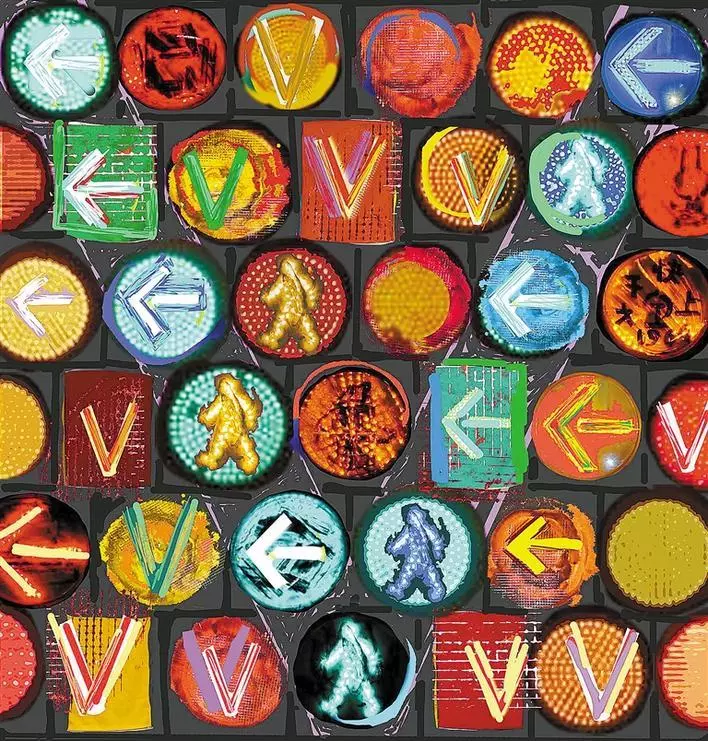 梁宇透露,這件作品的創(chuàng)作四易其稿,將信號(hào)燈所指代的“社會(huì)規(guī)則”加以排列強(qiáng)化,以此強(qiáng)調(diào)“秩序”本身在與疾病博弈混亂環(huán)境中的重要性。作品以濃烈的對(duì)比色彩、緊密排列的幾何圖形試圖傳達(dá)當(dāng)下人們的緊張情緒和焦慮心態(tài)。同時(shí),信號(hào)燈中“行走”、“前進(jìn)”、“Victory”的提示標(biāo)識(shí),被清晰地提煉出來(lái),成為能讓畫(huà)面安定的因素,望帶給觀(guān)者一點(diǎn)思緒的寧?kù)o與心靈的慰藉。