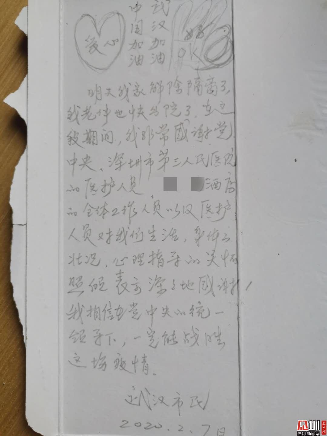 2月7日,一位來深的武漢市民在離開桃源定點(diǎn)隔離酒店前,匆忙中不忘撕下一片紙巾盒,用酒店的鉛筆留下一張暖心紙條,對陪他度過14天隔離期的工作人員表達(dá)由衷的感激,對全民抗“疫”的前景表示必勝的信心。