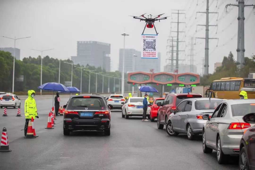 2月11日,在G94高速深圳觀瀾收費(fèi)處,深圳龍華機(jī)訓(xùn)大隊(duì)無(wú)人機(jī)飛行隊(duì)的民警操作懸掛有申報(bào)二維碼的無(wú)人機(jī)在候檢的車輛間飛行。