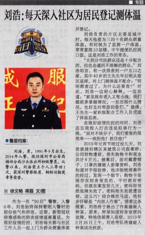 作為一名“90后”警察,入警6年,劉浩始終保持著剛?cè)刖瘯r(shí)的那份銳氣和拼勁。近期,新型冠狀病毒感染的肺炎疫情逐漸蔓延。為做好疫情防控,劉浩每天都與社區(qū)工作人員一起上門(mén)為群眾測(cè)量體溫并登記。