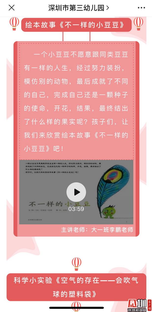 深圳市第三幼兒園園長邱雪華訴記者:“目前,三幼已經(jīng)開啟線上教學活動,我們充分運用公眾號、微信群等網(wǎng)絡平臺,與家長、幼兒充分互動,陸續(xù)推出具有健康促進特色的圖文推送,其中包括介紹防疫常識的攻略、由園長主講的園長電臺,還創(chuàng)辦了每日一期的原創(chuàng)系列游戲,以便家長在家也能獲取適宜的親子游戲活動資源。”記者在深圳市第三幼兒園的微信公眾平臺上看到,幼兒園線上互動內容豐富,其中包括視頻繪本故事、科學小實驗以及親子體育游戲。每個版塊均由深圳市第三幼兒園老師們主講示范并錄制視頻,便于孩子及家長學習。
