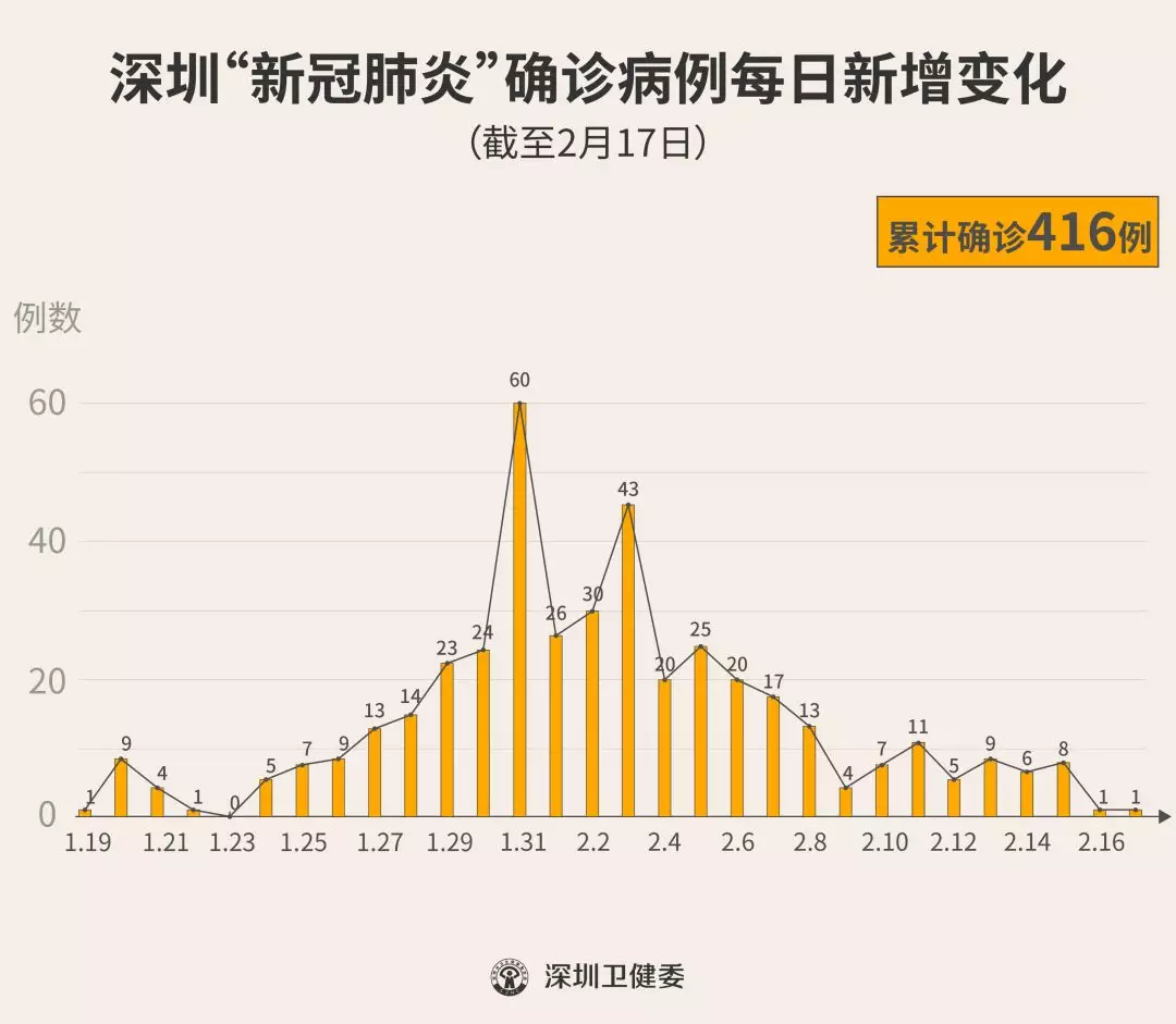 截至2月17日24時,深圳累計報告“新冠肺炎”確診病例416例。2月17日當(dāng)天全市新增確診病例1例(個案詳情今晚公布)。