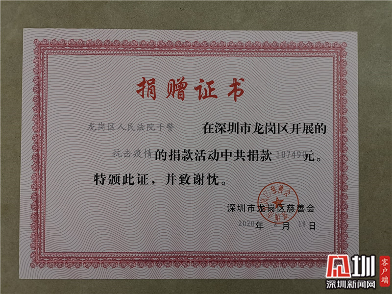 2月17日,在龍崗區(qū)人民法院黨組的倡議下,全院500余名干警紛紛慷慨解囊奉獻(xiàn)愛(ài)心,一天內(nèi)共募集善款107490元。