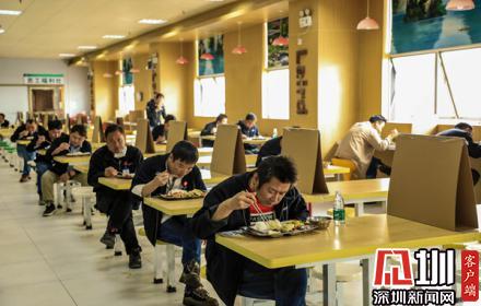 餐廳已經(jīng)見不到過去熱鬧的場景,員工們都按照地上間隔1米的“黃格子”保持著安全距離,全程沒有太多的交流。餐桌也被用擋板進行隔離,一人一桌,同向就坐,就餐完畢還有餐廳員工對桌面進行消殺。